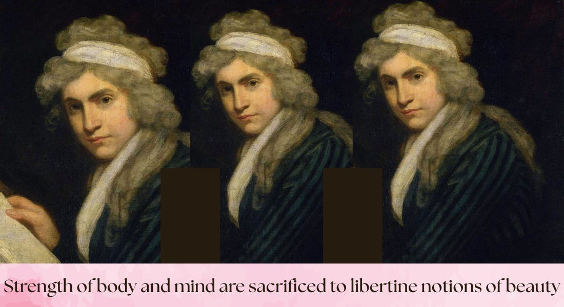 Using these ideas, philosophers of Wollstonecraft’s day argued that women because of their weak constitutions couldn’t handle more taxing on their systems, and thus shouldn’t participate in rigorous education. In fact, it would be better for them to let their minds and bodies rest at all times, as much as possible. Reserve their energy for what women were really for: bearing children. Outside the swirling thought world of philosophers, the wasting away disease of consumption (aka tuberculosis) shaped beauty standards in the late 18th century. Women of higher classes wanted to look sickly and frail. Wollstonecraft wrote of an acquaintance who bragged about her fragility as if it were some sort of achievement.